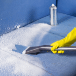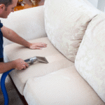 The process starts by checking the sofa’s fabric, identifying stains, and doing a patch test to avoid damage. Cushions are removed and the sofa is prepared for cleaning.